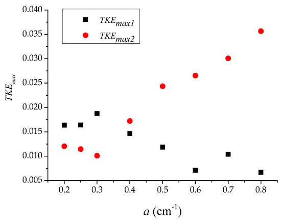 Figure 4 further presents the correlation between two relative turbulent energy peaks (TKEmax1 and TKEmax2) and the vegetation group density a. The first turbulent peak (TKEmax1) after the vegetation group was distributed in a wave manner with the increase in the density, a, of the vegetation group. Figure 4 suggests that the fluctuation range of TKEmax1 was short, whereas the second turbulent peak (TKEmax2) presented a large fluctuation range. Furthermore, TKEmax1 increased as the density a increased. The growth rate of TKEmax2 decreased first and then increased. When a = 0.8 cm−1, the turbulent kinetic energy reached its peak value.