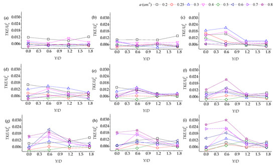 The lateral distribution of the dimensionless TKE. (a) X/D = −3 (b) X/D = −1.5 (c) X/D = 0.8 (d) X/D = 1.2 (e) X/D = 1.5 (f) X/D = 2 (g) X/D = 2.5 (h) X/D = 3 (i) X/D = 4.