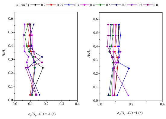Figure 6a shows that the upstream of a vegetation group is less affected by the flora and the turbulence intensity under different vegetation density exhibits a similar trend with the water depth; that is, the water depth first increased but then decreased. However, in some cases, the high density of plants affected the change of upstream turbulence. When a group of plant’s densities measured a = 0.6, 0.7, and 0.8 cm−1, their dense structure led to backwater, which affected the turbulent energy in the range of H/H0 = 0.2–0.3; the turbulent energy decreased. Hence, for plants with relatively high densities, the law of change describes an initial increase, then a decrease, and then a rise as the water depth increases.