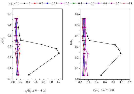 Sedimentation and erosion processes are profiles of the vertical momentum flux () [15]. Figure 9 shows the vegetation density effect on the Reynolds shear stress, where Tuw is related to the water depth change at X/D = ±1 and Y/D = 0, demonstrating that u0w0 is positive at X/D = 1. Hence, momentum transport is upward into the water column. Furthermore, we found extremum Reynolds stress values behind the patch with low densities (a < 0.3 cm−1) at H/H0 = 0.25, while the highest values of u0w0 always took place near the bed.
