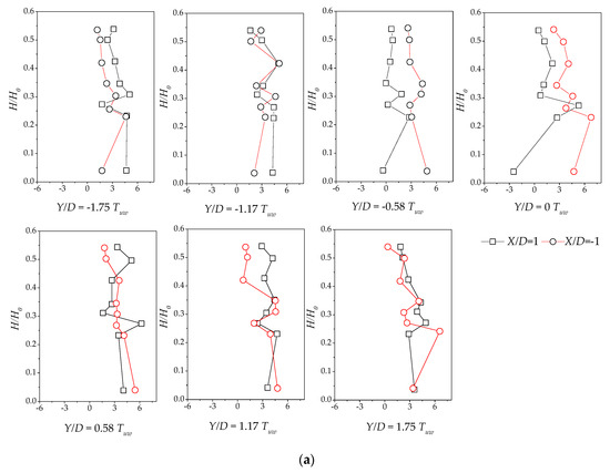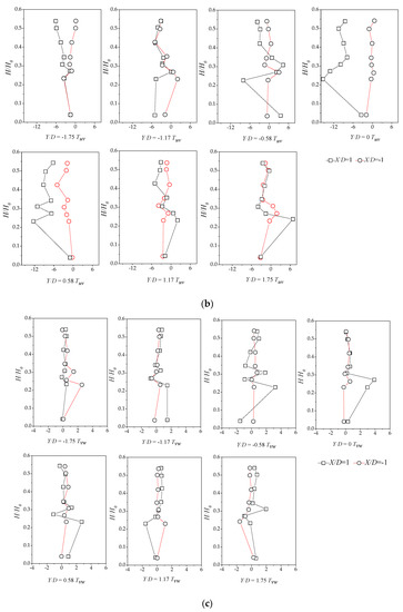 Figure 8b depicts the vertical distribution of the shear stress, defined by . The value of the Reynolds shear stress at the centerline and downstream at X/D = 1 is much smaller than that of the downstream (X/D = −1). The prevalence of outward and inward events is accountable for the decreasing magnitude of the shear stress at X/D = 1. In addition, the difference in the vertical distribution on both sides of the centerline becomes smaller as it gets closer to the sidewall. A comparison of Figure 8a,b reveals that the vertical distribution of two Reynolds shear stresses fluctuates markedly for H/H0, varying from 0.2 to 0.3, which could be the most intense place for the bleed flow and the recirculated flow, suggesting that the bed influence on the vertical distribution of the Reynolds stress is limited.