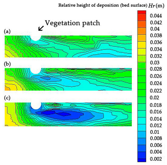 Reportedly, enhanced deposition upstream was observed in a vegetated region [21,43], which could be attributed to the deceleration of the flow, bed shear stress (Figure 10), and high levels of erosion at the leading edge of high-density patches (Figure 11). Although we did not measure the deposition inside the dense patch in this study, previous studies reported the elevated TKE and scouring within dense patches [44].