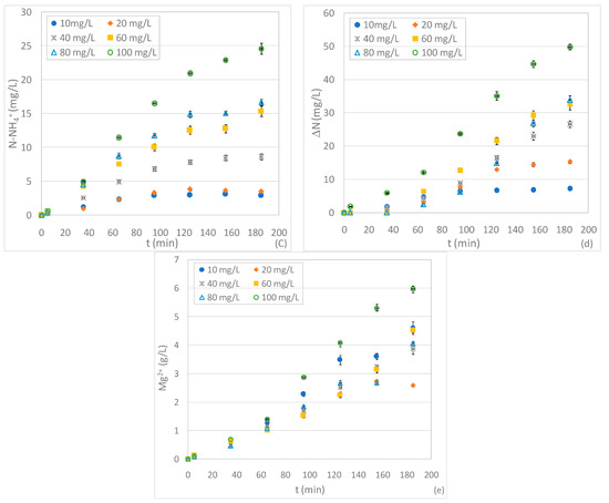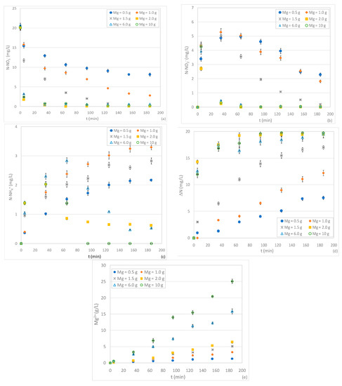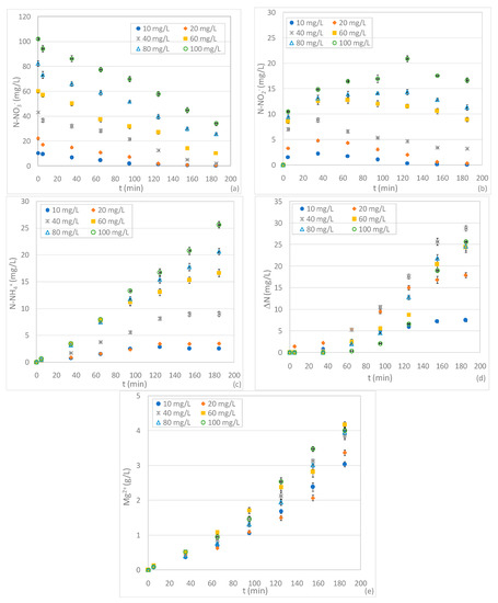 Figure 5. Concentrations of N-NO3 (a), N-NO2 (b), N-NH4+ (c), ΔN (d) and Mg2+ (e) during the tests carried out at pH 7, with 2 g of Mg0,varying the initial N-NO3 concentration between 10 mg/L and 100 mg/L.
