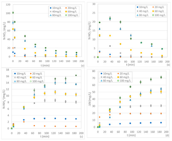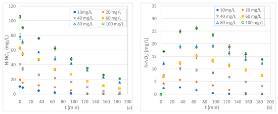 Similar to the experiments discussed in the previous section, the nitrite concentration showed initial growth trends followed by decrease phases (Figure 3b). The lower initial nitrite production was monitored by treating the solution with a nitrate concentration of 20 mg/L. In effect, the test with 10 mg/L also exhibited higher initial N-NO2 concentrations which, anyhow, were subsequently completely consumed (Figure 3b). The progressive increase in initial nitrate concentration in the standard solutions caused major nitrite productions and, consequently, the growth of residual N-NO2 (Figure 3b).