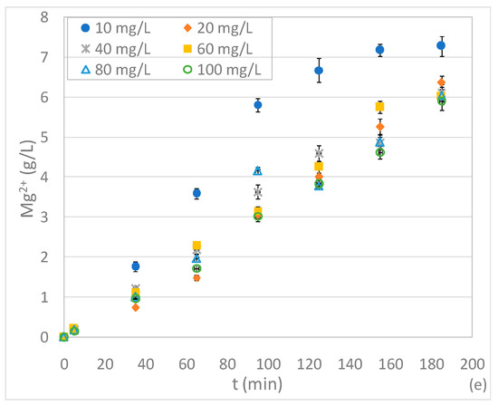 In addition to these results, a decline in performance was unexpectedly detected when reducing the initial nitrate amount below to 20 mg/L. In fact, in the test with 10 mg/L, an abatement of about 82% was reached after only 95 min (Figure 3a). This process deterioration occurred in spite of the high Mg/NNi ratio equal to 0.67 g/mg. These results suggest that, for pH 3, the ratio between the dosage of Mg0 and nitrate cannot be considered the univocal parameter upon which NO3 removal depends. In effect, it can be presumed that low initial nitrate concentrations slow down the reaction rate. Moreover, in the presence of low initial amounts of NO3, in a strong acidic solution, Mg0 reacts mainly with water and oxygen causing an appreciable deterioration in performance. This hypothesis was confirmed by the trends of Mg2+ concentration over the reaction time (Figure 3e). Indeed, with 10 mg/L, despite the rather slow nitrate reduction, major accumulation of Mg2+ was observed due to the solubilization of Mg0 promoted by the marked acidic environment (Figure 3e). The ineffectual utilization of reactive material was demonstrated by the ratio between the Mg consumed and the nitrate removed which, even considering only the first minutes of treatment, was about 33.0 mol/mol. This value is notably higher than the 4.53 mol/mol previously mentioned and underlines a great loss of magnesium.