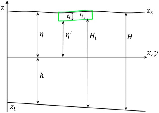 Equations (1) to (5) return to the shallow water equations with ice effects when wave dispersion terms are ignored, and they become the BE proposed by Tonelli et al. [25] by ignoring the ice effects. The flux gradient term and source terms are reformulated in a well-balanced form to avoid difficulties in applying to steep topography [26]. In comparison to the version of Boussinesq equations proposed by Tonelli and Petti [25], the main modifications presented in Equation (1) lie in the source terms that consider flow viscosity , ice effects on mass conservation , and ice friction effects on momentum changes .