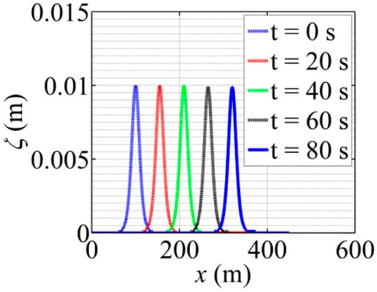 The stability and conservative properties of the Boussinesq wave model is tested by the simulation of solitary wave propagation in a flat, frictionless channel, as in Orszaghova et al. [32]. The channel length is 500 m and width is 80 m. The uniform grid resolution is 5 m. The solitary wave with an amplitude of 0.01 m is assumed at m in the otherwise still water channel with a depth of 1 m. The total simulation time is 80 s. The simulation stopped before the wave could reach the downstream boundary, and there is no special treatment for the reflective boundary. Since the bed is frictionless, the initial solitary wave is expected to propagate downstream with the same profile. Simulated results in Figure 3 show that the wave form is preserved during its propagations at different times of 0, 20, 40, 60, and 80 s. This confirms the accuracy of the model.