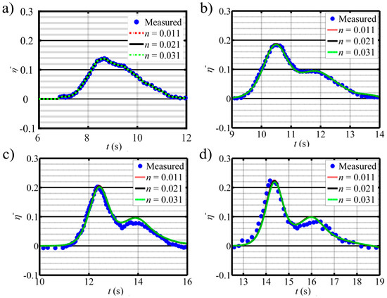 Comparison between measured and simulated waveforms with different Manning roughness at x = (a) 10 m, (b) 14 m, (c) 18 m, and (d) 22 m.