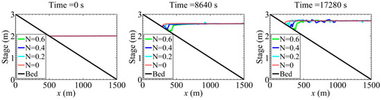 A 1500 m long beach with a constant slope of 0.002 is used to show the interaction between the tsunami wave and ice. A 2 m still water level is assumed to be the initial sea water level without wave. A surge increasing from 2 m to 2.7 m within 4 h and remaining at 2.7 m afterward is used as the upstream boundary at 1500 m. The flow velocities at upstream nodes are calculated from the flow equations. The bed roughness coefficient is 0.025. With the same flow boundary, four separated simulation runs are conducted to show the effect of ice concentration. Along with the incoming surge, surface ice with a thickness of 0.1 m and a concentration (N) of 0.0, 0.2, 0.4, and 0.6, respectively, is issued at the upstream boundary. The downstream boundary at is supposed to be the discharge, but these boundaries nodes are dry and zero velocities are assigned in the dry beach nodes. The downstream boundary is a dry beach and is reflective. No wave-breaking is considered. The spatial grid resolution is 5 m, and the width of the domain is 100 m. The ice roughness increases linearly with its thickness from 0.02 to 0.06. The uniform grid resolution is 1 m and the total simulation time is 5 h. The simulated final stages are shown in Figure 5, which illustrates wave propagation along the beach for various incoming ice concentrations. When the ice concentration increases, the wave moves slower and its run-up distance is shorter. The ice attenuates the wave, as wave energy dissipates faster with the increasing ice concentration. In addition, ice climbs higher on the beach when the ice concentration is lower. That means the wave energy is stronger in pushing ice up on the beach, in terms of lower ice concentration. The existence of a large amount of ice causes more energy loss, due to interactions between waves and ice.