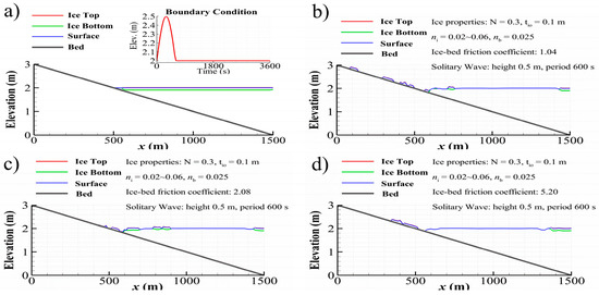 Simulated ice depositions on the beach under a tsunami wave with different ice-bed friction coefficients: (a) Initial water surface, ice bottom and top elevations, and the tsunami wave boundary conditions; simulated water surface and ice depositions on the beach with the ice-bed friction coefficient of (b) 1.04, (c) 2.08, and (d) 5.20. The red line in the subfigure is the upstream water level boundary.