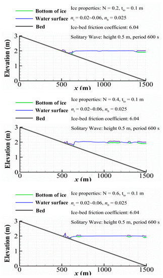 Ice deposition on the beach is examined in this case. The upstream boundary conditions are provided at by a solitary wave increasing from 2.0 m to 2.5 m with a period of 600 s, as shown in the insert of Figure 6. Since the downstream boundary is the dry beach, the wave is reflected back there without considering wave breaking processes, the same as that in Section 4.1. The single solitary wave is used to represent the tsunami wave. Initially, the water is at rest and the velocity is zero in the whole domain. The water surface is covered by ice with an initial concentration of 0.3 and thickness of 0.1 m. Three simulation runs are conducted for ice deposition on the beach affected by different ice-bed frictions, respectively. Three ice-bed friction coefficients (defined as and is the ice-bed friction angle), 1.04, 2.08, and 5.20, are examined and their corresponding ice-bed friction angles are 46°, 64°, 79°. The friction force between ice and the beach increases with the growing ice-bed friction coefficient. When the ice-bed friction is larger, ice deposition on the beach is larger but the ice run-up is smaller. For a given ice-bed friction coefficient of 6.04 or = 81°, the water surface is initially covered by ice parcels with three ice concentrations, 0.2, 0.4, and 0.6. Using the same solitary wave, the final ice depositions on the beach are shown in Figure 7 for simulated results at 3600 s. The ice top indicates the top elevation of the floating ice, and its bottom location is represented by ice bottom with “Surface”, indicating water surface level in all following figures. When ice concentration increases, the ice deposition area decreases, but the maximum accumulated ice thickness increases. The tsunami wave driven ice deposition is sensitive to the ice-bed friction coefficient and the initial ice concentration.