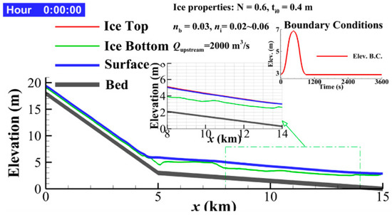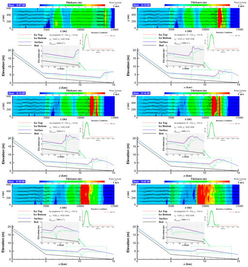 The ice thickness distribution, velocity profiles, longitudinal water surface, and ice profiles are shown at simulation times of 7.5, 12, 13, 14.3, 18, and 22.5 min in Figure 9. The top plots show the ice thickness accumulations in color from the ice jam and water velocity vectors in the two-dimensional domain. The longitudinal water level, bed elevation, and ice thickness profiles are shown in the lower plots with enlarged plots for the area in the green box. The downstream boundary is shown in the middle right plot with a red line for the intruding wave and green points for wave height at current simulating time. When the intruding wave propagates and meeting flow and ice blocks from upstream, ice thickening appears at the wave front and gradually grows into an ice jam at 12 min. The maximum thickness of the ice jam exceeds 6.5 m and the jam bottom reaches the channel bed. After that, ice jams are partially released and then reformed upstream, due to accumulations of ice with decreasing wave height from 13 to 22.5 min. The ice jam moves further upstream as the wave propagates upstream. During the propagation, the wave attenuates and the size of the ice jam decreases. Finally, the wave dies out and the ice jam is released.