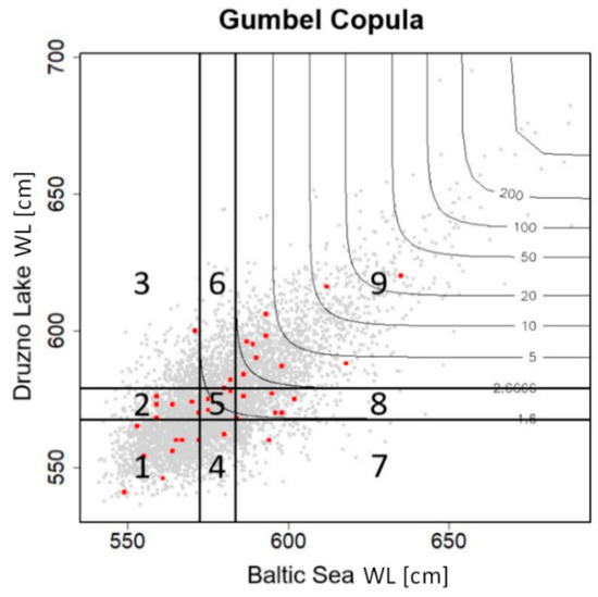 Like the coefficient of correlation, modeling correlations by means of a copula function permitted the determination of the strength of correlations between water levels in lakes and the Baltic Sea. An additional advantage of the copula function was the possibility of quantifiable determination of the probability of occurrence of each analyzed variable separately and the probability of co-occurrence of maximum water levels in lakes and the sea, as well as the degree of their synchronicity.