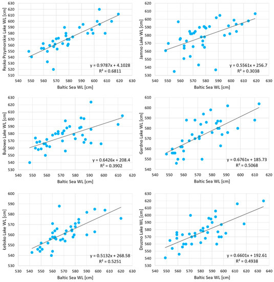 The highest correlations of monthly water levels in the lakes and the sea were usually observed in autumn, winter, and spring (Figure 3). This is generally related to lake alimentation in the autumn–winter period, where marine waters enter lakes through canals as a result of storms [33,61]. Storms on the Baltic Sea are usually observed from October to March and last from four to seven days [62].