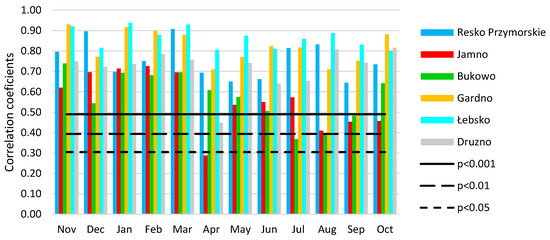 Coefficients of correlation between maximum monthly water levels in lakes and the sea were high and in the majority of cases statistically significant (p < 0.001) (Figure 4). The strongest and most statistically significant (p < 0.001) correlations with sea water levels were usually observed in the cool half-year, in the months from November to March. The highest coefficients of correlation between the analyzed lakes and the Baltic Sea (>0.90) were recorded in November, January (Gardno, Łebsko), and March (Resko Przymorskie, Łebsko). Water levels in three lakes, namely Gardno, Łebsko, and Resko Przymorskie, strongly correlated with sea water levels also in summer–autumn months. The weakest correlations of water levels in lakes with sea water levels were observed in April. Nonetheless, only the water levels in Lake Jamno correlated statistically nonsignificantly with sea water levels.