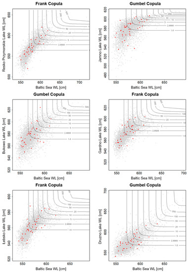 The observed strong effect of the sea on changes in the ecosystem of coastal lakes co-occurs with modern climatic changes. Changes in the thermal regime and water levels of the sea will undoubtedly affect lake ecosystems even more strongly, increasing the importance of this research. The possibility of forecasting and the accuracy of forecasts of one variable (water level in lakes) by means of another variable (sea water levels) depends on the degree of dependency between them. The dependency between variables is usually analyzed by means of the Pearson linear correlation coefficient, as well as Spearman and Kendall rank correlation coefficients. These correlation measures have their drawbacks, however, which in the case of analyses of correlations between variables may affect their credibility. According to literature on the subject, linear correlation is not a resistant measure [38]. This means that untypical observations (so-called outliers) can significantly affect the value of the correlation coefficient. The correlation also shows no invariance toward nonlinear transformations. Copulas and related measures of correlation strength have no such drawbacks. They are exceptionally useful and practical approaches in studies on correlations between random variables. The copula theory has already been applied in limnological research, e.g., in the determination of the probability of occurrence of hydrological draught in Lake Poyang and the Yangtse River system [39], in the determination of correlations between extreme water levels in Lake Ontario and the Saint Lawrence River [40], in the determination of correlations of water levels in the Great Lakes and the Saint Lawrence River [41], and in an analysis of the quantity of water supplied to dam reservoirs in the context of forecasting the occurrence of draught [42]. This paper points to the possibility of obtaining new information resulting from the applied new research approach. It concerns, for example, separate and combined probabilities of the occurrence of maximum water levels in lakes and the sea (probabilistic assessment of correlations of maximum water levels in lakes and the sea).