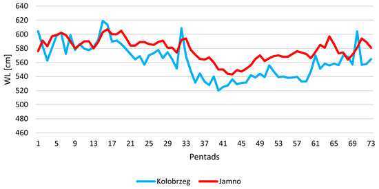 In spring, in the melt season, alimentation with river waters is dominant. Months in which strong correlations were observed also corresponded to the course of water levels in lakes in the annual cycle. This was exemplified by the presented graph on the course of maximum pentad water levels in Lake Jamno and the Baltic Sea at station Kołobrzeg in the analyzed multiannual period (Figure 6). The maximum pentad water level was calculated as the averaged value of maximum water levels in the lake for a consecutive five days. The highest maximum water levels in the average annual cycle in Lake Jamno and Kołobrzeg were observed from December to January and from September to October.