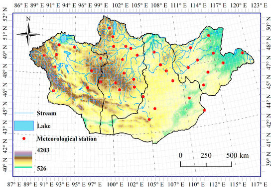 The nation of Mongolia is adjacent to northern China and southern Russia, covering an area of approximate 1.56 × 106 km2 bounded between 41.59°N–52.14°N and between 87.76°E–119.93°E (Figure 1). The average elevation is about 1500 m and decreases gradually from the west to the east. This region is characterized by an extreme continental climate, with long and frigid winters, and short and warm summers. The hottest air temperature record is 35 °C in summer and the coldest temperature is −45 °C in winter. Mean annual precipitation is approximately 200 mm and more than 200 mm in the north and less than 100 mm in the south, with about 70% falling in July and August [24]. The precipitation shows a decreasing trend from north to south, while air temperature increases from south to north. Permafrost is mainly distributed in the northern part of Mongolia. Land cover types consist of forest, grassland, cropland, desert, and barren from north to south in Mongolia, of which desert occupies about a quarter of the area in the southern part, and grassland is the dominant vegetation type in the center part.