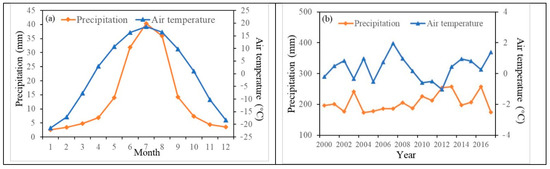 The monthly precipitation and monthly average air temperature (a), the annual precipitation and average air temperature (b). Values are the average of all meteorological stations.