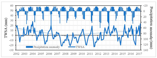 Time series of GRACE−inferred Total Water Storage Anomaly (TWSA) and observed precipitation anomaly for Mongolia from 2002 to 2017.