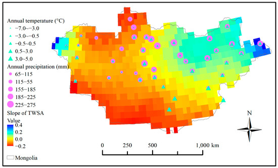 The distribution of the Thiel−Sen’s slope of TWSA and mean annual air temperature and annual precipitation for each meteorological station.
