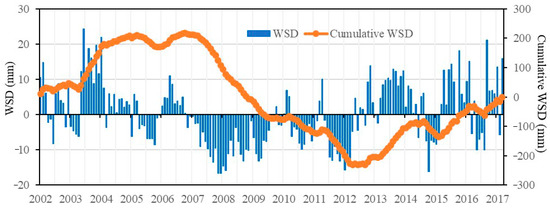 Time series of water storage deficit (WSD) and cumulative WSD for Mongolia from 2002 to 2017.