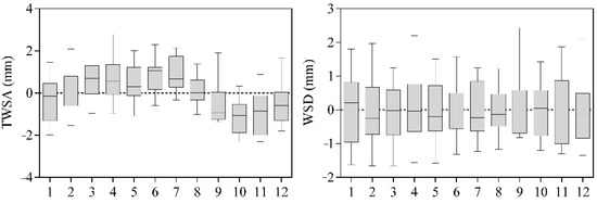 Box−plots showing the inter−annual change trends of total water storage anomaly (TWSA) and water storage deficit (WSD) in Mongolia from 2002 to 2017.
