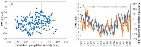 The correlation between TWSA and cumulative precipitation anomaly (a), and the series of WSD and cumulative precipitation anomaly (b).