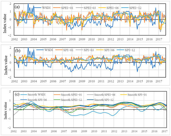 Comparisons between water storage deficit index (WSDI) and two other drought indices (SPEI (a) and SPI (b)) and after smoothing (c) in 1−,3−, 6−, and 12−month scales.