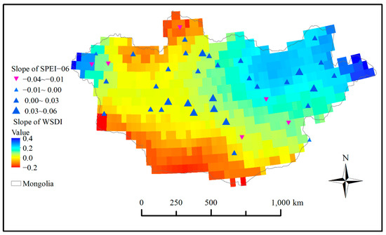 Additionally, the MK test was used to detect the trend change of WSDI and SPEI−06 and the slopes of the change are shown in Figure 9. Most trends of WSDI and SPEI−06 in Mongolia show an increasing trend, which indicates the drought condition in Mongolia improved. However, the northernmost and southernmost parts still experience severe drought trends. The distribution of the slope values of SPEI−06 are in agreement with slope values of WSDI.