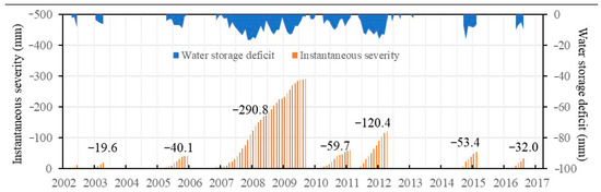 Instantaneous severity and associated total drought severity values and water storage deficit determined for GRACE−observed data.