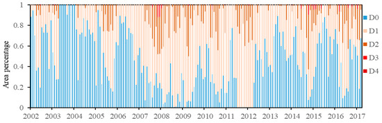 Percentage area of Mongolia subjected to droughts at different levels of severity based on WSDI from 2002 to 2017 (D0: no drought; D1: mild drought; D2: moderate drought; D3: severe drought; D4: extreme drought).