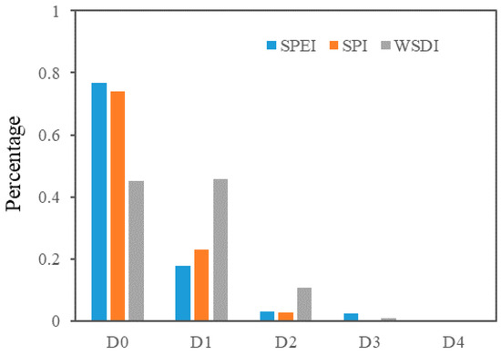 The drought severity of the area in Mongolia affected by different drought levels is assessed. The spatial distribution of drought areas represented the change process of different drought levels. The statistical results show the area’s change suffering from different drought levels. The time series of the monthly area percentage in different drought levels are shown in Figure 11 and Figure 12 to discern the change of drought severity. The largest area affected by drought (D1 and D2) occurred in the 2011–2012 drought event, which caused 71% of Mongolia to suffer a mild drought (D1) and 19% for a moderate drought (D2). From 2007 to 2008, 79% of Mongolia area suffers mild drought (D1), 29% moderate drought (D2), 5% for severe drought (D3) and 1% extreme drought (D4). The frequency of D0 from SPEI and SPI was the highest, while frequencies of D0 and D1 from WSDI were similar to one another (Figure 12). Overall, most of Mongolia experiences mild drought, and severe drought occasionally, although there were differences among these drought indices.