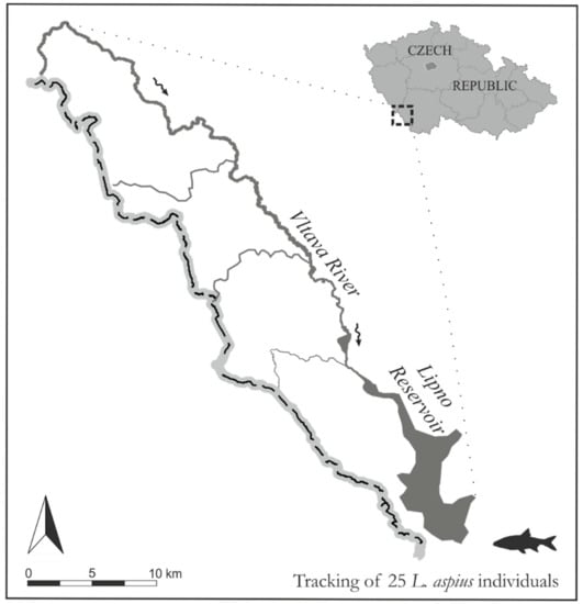 This study was performed in the headwaters of the Vltava River, which flows into the Lipno Reservoir, Šumava National Park, the Czech Republic (Figure 1). The primary study area included approx. 30 km of the main free-flowing channel of the Vltava River and the first 15 km of the Lipno Reservoir. The study area was delimited upstream by the occurrence of asp in the Vltava River and downstream by the excessive depth of the reservoir. Regular attempts to track the fish outside the primary study area were conducted; however, the success was very low due to the limited range of the radio telemetry transmitters at depths greater than 5 m. The Vltava River headwaters consist of mountainous (approx. 730–756 m above sea level) and oligotrophic streams with a predominantly pristine morphology. The main channel gradient within the study area is low, where the river meets the reservoir the gradient is only 0.4 ‰. The Lipno Reservoir represents a typical heavily modified waterbody (surface area 46.5 km2; length 42 km, maximum depth 25 m; maximum width 5 km) with multifunctional uses, including hydropower, flood protection, flow augmentation, and recreational activities, such as angling and sailing.
