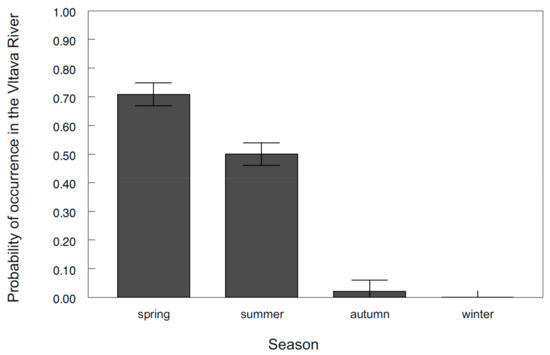 Probability of asp occurrence in the Vltava River across seasons. The values are the means ± the standard error (S.E.).