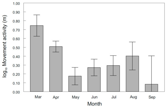 Asp movement activity in the Vltava River across months. The values are the means ± the standard error (S.E.).