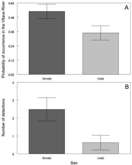 Sexually determined differences in the probability of asp occurrence in the Vltava River (A) and the number of detections (B). The values are the means ± the standard error (S.E.).