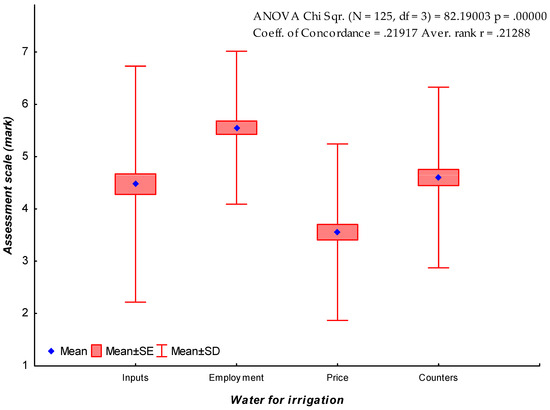 Figure 3 shows the comparison between the mean values given by the participant regarding some aspects such as the generation of employment and inputs or the level of satisfaction about the current price and management of water for irrigation. People consider irrigated agriculture highly favorable, as a way of generating employment, i.e., giving hours of work for the regular inhabitants. Nevertheless, this perception is not so high regarding the inputs. Although people are moderately satisfied with the installation of individual counters, there is a low level of satisfaction with the current price of water for irrigation (0.02 EUR/m3).