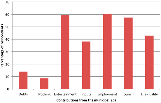 Figure 4 shows in a column graph, the percentage of people that agree with some negative/positive effects of the construction and current use/management of the municipal spa. Broadly speaking, people consider the installation of this leisure facility quite positive. For instance, ca. 60% consider it is providing entertainment and employment for local people and it is a good tourism attraction for “sharing” or “stealing” visitors to the city of Mérida. Less than 20% of people think this spa is not generating anything (8.5%) or even it is generating debts for the local economy (14.0%). Around 40% of people think the spa is helpful to improve their quality of life and it is a good source of income for the local council.