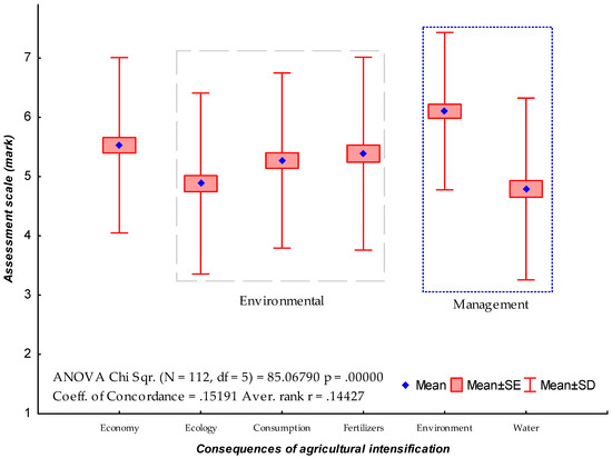 Comparison of mean values of the degree of importance that local people gave to the effects of intensification on (left to right) economy, ecology, water consumption, overuse of agricultural products, as well as on the necessity of improvements in the environmental and water managements.