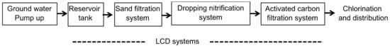 We installed an LCD water treatment system depicted (Figure 2) comprising a sand filtration unit for iron removal, dropping nitrification process for ammonium removal, and activated carbon filtration unit for final filtration. We pumped up the groundwater into the first reservoir tank, and supplied it to the LCD systems by gravity flow at a flow rate of 1000–3000 L/day. The sand filtration unit for iron removal was constructed after the traditional filtration method used in the Kathmandu Valley. Four types of sands, namely, coarse aggregate (20–40 mm), coarse sand (>4.75 mm), medium sand (4.75–2.36 mm) and fine sand (<2.36 mm) were filled in 1000 L of tank to arrange the layers. Groundwater was supplied from the top of the reactor (down flow operation). For the ammonium removal, we made a 4-m high cylindrical reactor with a 1-m radius with locally available materials, in which, trickling filters made of acrylic fiber that are microbial carriers were suspended. Iron removed from groundwater was sprinkled into this bacterial carrier from the top of the system. Nitrifier bacteria can grow on the carrier by using ammonium in groundwater and oxygen from the air, resulting in ammonium removal by nitrification can be achieved through the system.