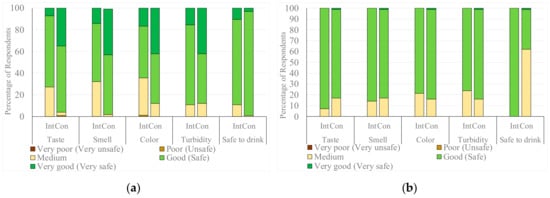 Perception of quality and safety of main source of drinking water in: (a) pre-intervention period and (b) post-intervention period. Int = Intervention site and Con = Control site.
