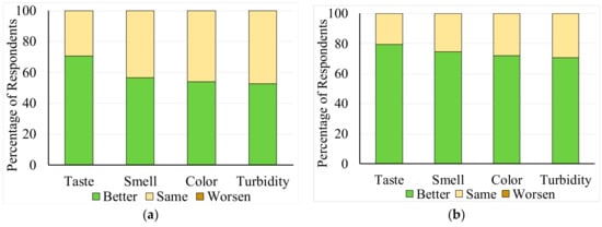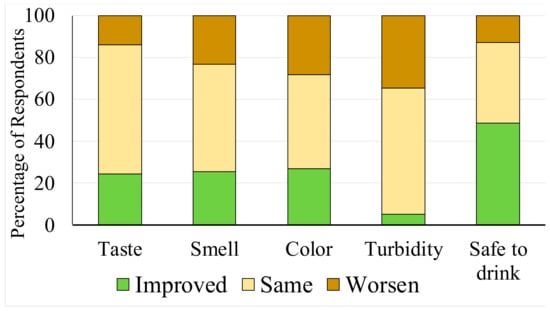 One reason for these inconsistencies is that the results in Figure 4a,b were affected by recall bias about the situation in the pre-intervention period that was almost 1 year before the post-intervention survey. Another possible reason for the inconsistency is the changing criterion of the judgment of water quality during 1 year: more specifically, individuals might have desired higher quality and safer drinking water; thus, the perception in the post-intervention survey was stricter than before. This notion was supported by the results at the control site: all perception parameters became worse, especially for the perception of safety, and the number of households applying in-house treatment of drinking water significantly increased in the post-intervention survey. The reason for the change was unclear, but our survey might have been a trigger for changing the respondents’ mindset regarding water security.