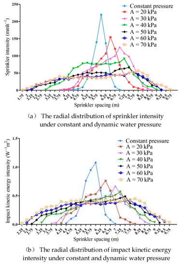 2.2.1. Radial Distribution of Sprinkler Intensity and Impact Kinetic Energy Intensity under Constant and Dynamic Water Pressure
