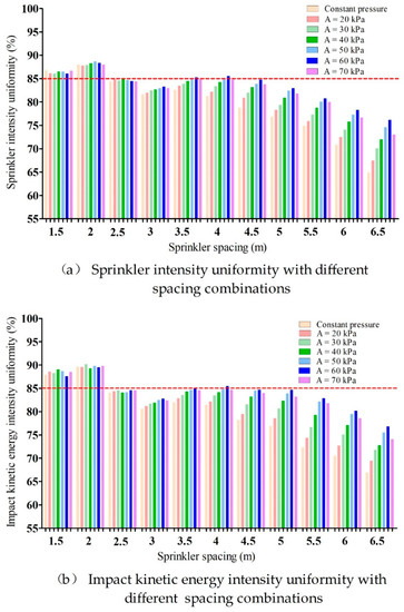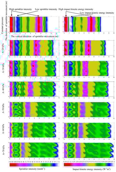 2.2.3. Combined Sprinkler Intensity and Impact Kinetic Energy Intensity Distribution under Different Nozzle Spacings