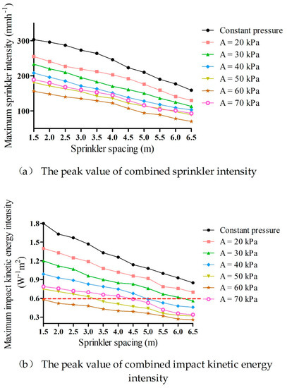 | Amplitudes (kPa) | Spraying Range (m) | The CV of Sprinkler Intensity (%) | The Peak Value of Sprinkler Intensity (mm/h) | The CV of Impact Kinetic Energy Intensity (%) | The Peak Value of Impact Kinetic Energy Intensity (W/m2) |