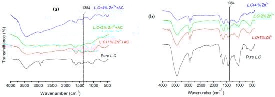 Figure 1 shows that the spectrum of pure L.C has a vibration band at 3438 cm−1 which corresponds to the O-H bond present in cellulose, hemicellulose, and lignin. In the presence of different percentages of Zn2+ (1%, 2%, and 4%), obtained by precipitation (Figure 1a), the band of hydroxyl groups is observed at 3435, 3430 and 3414 cm−1. The decrease in the position of these bands can be attributed to the presence of elongation vibration of the Zn-OH bond, between Zn2+ and cellulose []. These results indicate that the hydroxyl groups have a strong interaction with Zn2+.