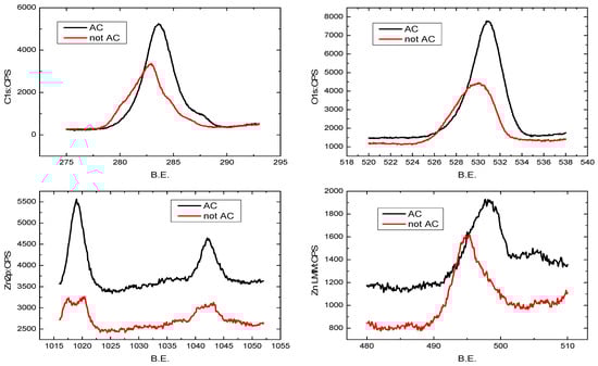XPS measurements were performed in order to clarify the main difference between the syntheses of the hybrid material with and without AC. Based on IR characterizations; Zn is strongly bound to the lignocellulosic surface by OH hydroxyl ions which are confirmed by the presence of O-Zn-O and O-Zn bonds. Figure 2 displays the main XPS results for the hybrid material L.C + 4% Zn2+ synthesized in the presence and absence of AC. The high-resolution XPS spectra of C(1s), O(1s), Zn(2p), Zn LMM+ show noticeable differences between the material synthesis by the two methods. However, neither of them showed any impurities. The C(1s) peak, depicts a chemical shift by +/−0.5 eV in comparison with the C(1s) spectra observed for the hybrid material synthesized in absence of AC (not AC) (282.5 eV) towards a relatively high binding energy positioned at 283 eV specific to C=O and O–C–O []. Similar behavior was observed for the O(1s) peak which is positioned at the binding energies of 529.9 and 531.2 eV for the hybrid material L.C + 4% Zn synthesized in absence and presence of AC, respectively. These contributions can be assigned to O2− ions in the Zn-O bonding and to O–H groups of adsorbed water molecules []. The four peaks observed at the binding energies of 1017.5, 1020 and 1040 and 1044.5 eV, correspond respectively to the zinc oxide (ZnO) and the spin orbit of Zn (2p3/2) and Zn (2p1/2) for the material synthesized in absence of AC []. In presence of AC, two main peaks located at 1021 and 1043.5 eV are assigned to the Zn(2p3/2) and Zn(2p1/2) energy levels.
