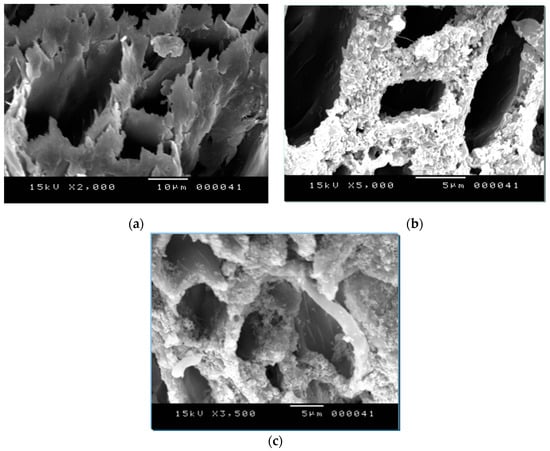 SEM characterizations were performed to gain further insight into the distribution of Zn2+ obtained from (Zn(NO3)2·6H2O on the L.C surface by precipitation in presence and absence of AC. Figure 3 shows the obtained micrograph of the pure L.C (Figure 3a), hybrid material (L.C + 4% Zn2+) synthesized by precipitation (Figure 3b), and hybrid material (L.C + 4% Zn2+) synthesized under AC (Figure 3c). L.C presents a rough structure and a homogeneous appearance which is formed by bonded multicellular fibers (Figure 3a). This indicates that the existence of a large number of hydroxyl groups could provide effective interaction between L.C and Zn2+ [,]. Figure 3b,c refer to the hybrid material (L.C + 4% Zn2+) synthesized in the absence and presence of AC. Here the Zn2+ deposit is well visible and well-fixed onto the L.C and exhibits good dispersion without significant aggregation. The use of AC has enhanced the distribution of Zn2+ into the L.C fibers.