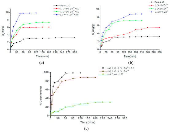Kinetics of retention of methylene blue (MB) onto different materials used L.C; pH = 10, Ci = 10 mg/L, m = 0.1 g, T = 298 K. (a) hybrid material L.C + 4% Zn2+ synthesized in presence of AC, (b) hybrid material L.C + 4% Zn2+ synthesized in absence of AC, (c) % color removal using different materials.